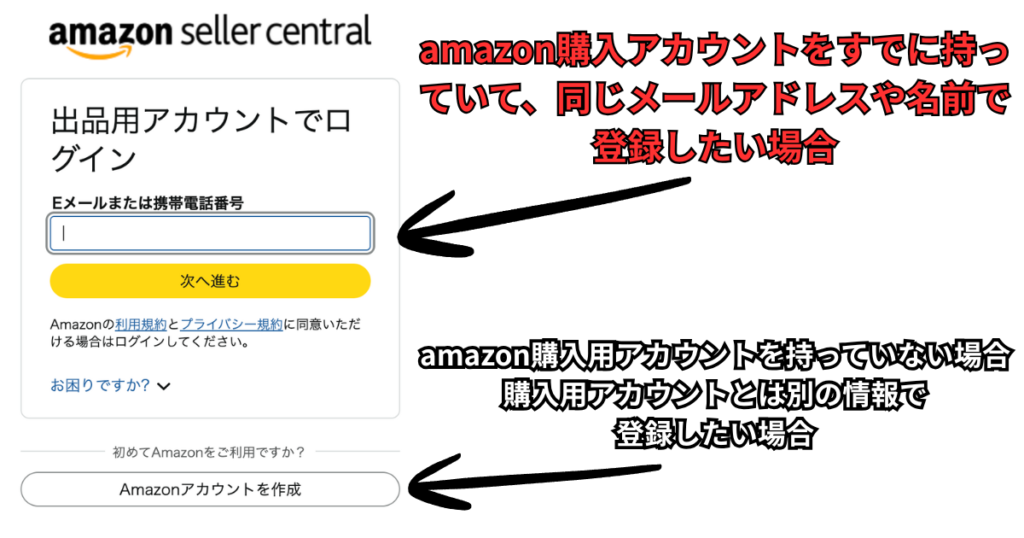 ※Amazon購入アカウントをすでに持っている場合と、持っていない場合では作成手順が少し異なります(詳しくは後述)。
