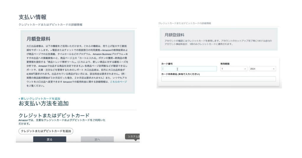 ここでは、Amazon大口出品の月額登録料を支払うためのクレジットカード情報を入力します。