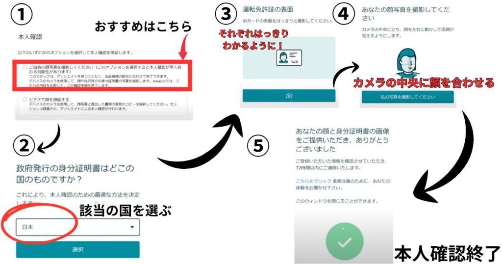 本人確認は、下記の手順①〜⑤の順に進めてください。